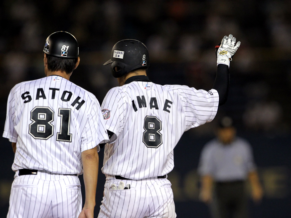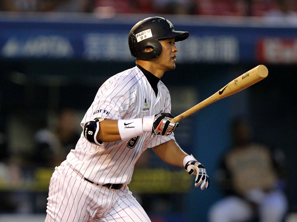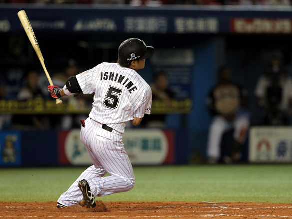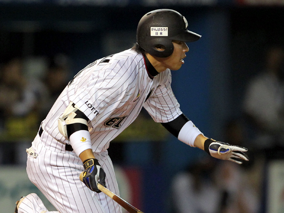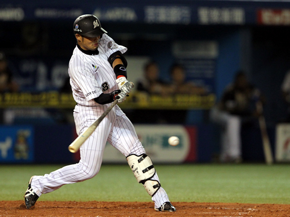 6番 里崎 中安 センターへのヒットを放つ 1塁 |