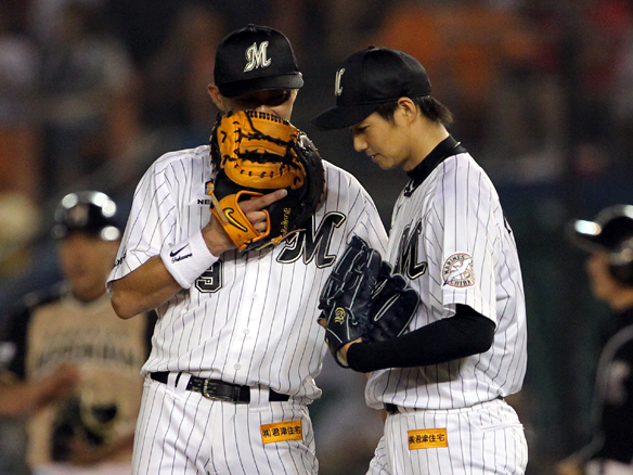 ピンチを迎えた唐川に声をかける福浦
