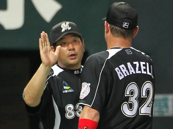 6番 里崎 四球 一度もバットを振ることなくストレートのフォアボールを選ぶ 1塁 |