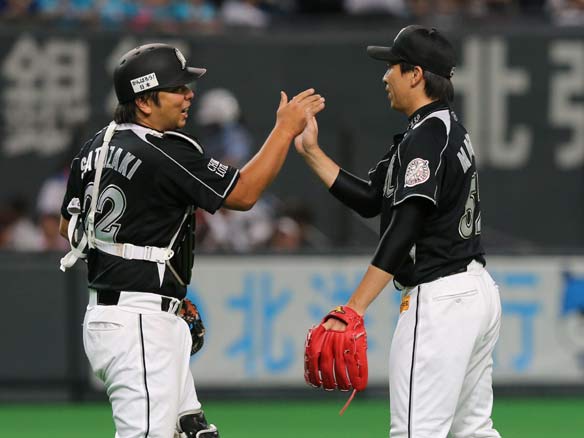 3者凡退で試合を締めた益田は里崎とタッチ!