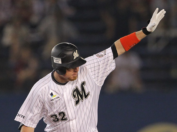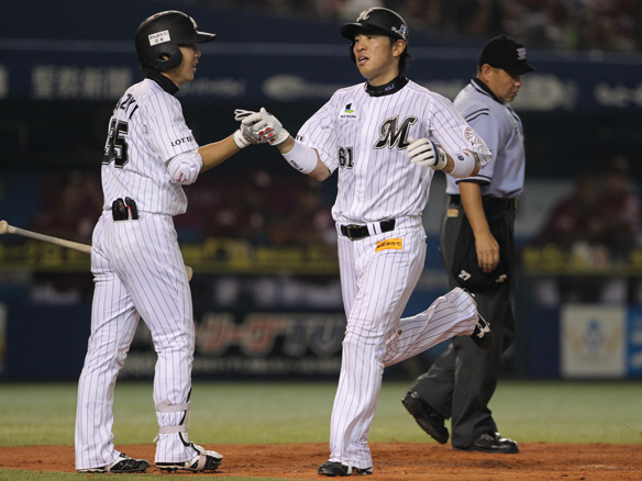 1番 荻野貴 左中二 2アウト3塁の1-1からレフトへのタイムリーツーベースでロッテ先制! ロ1-0楽 2塁 ![]() 1