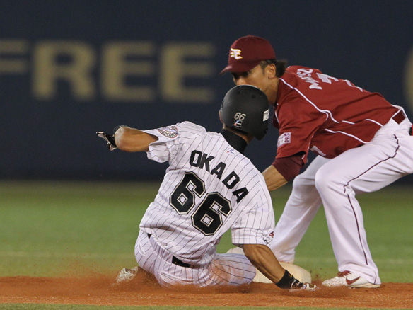 岡田は果敢に次の塁を狙うも阻まれる