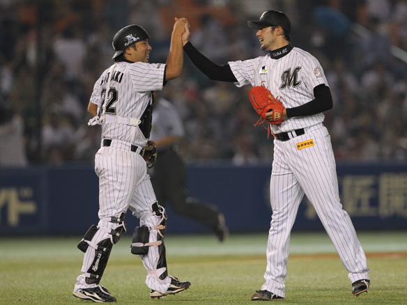 最後を締めた内が里崎とハイタッチ!