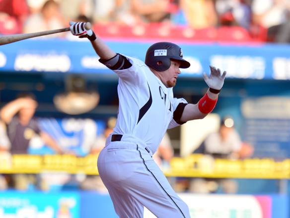 ブラゼルはフルスイングでライトへのヒットを放つ!