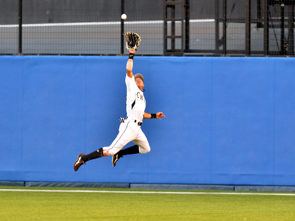 岡田がライナー性の打球に飛びついて捕球するファインプレー!!