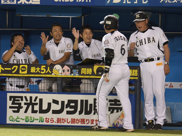 先制の22号ソロを放った井口がチームメートとタッチを交わす!