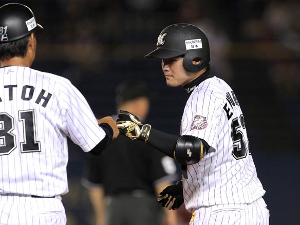 4番 ブラゼル 右飛失 岡島(右)の落球により出塁する 2塁 |