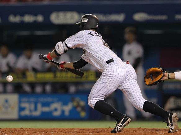 3番 聖澤 投バ安 三塁線へ絶妙なセーフティバント!内野安打で出塁する 1,2塁 |