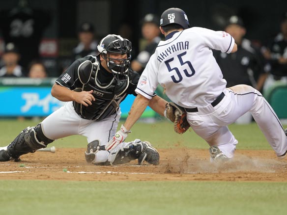 1塁走者秋山は3塁ベースをけってホームに向かうもアウト! 西5-0ロ 2アウト2塁 |