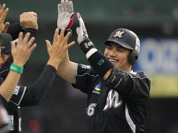 ソロ本塁打を放った井口はチームメートの祝福を受ける