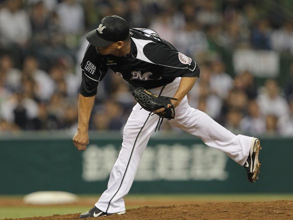 投手 ウィリアムス 9番 里崎 空三振 外角のシュートに空振り三振 1アウト |