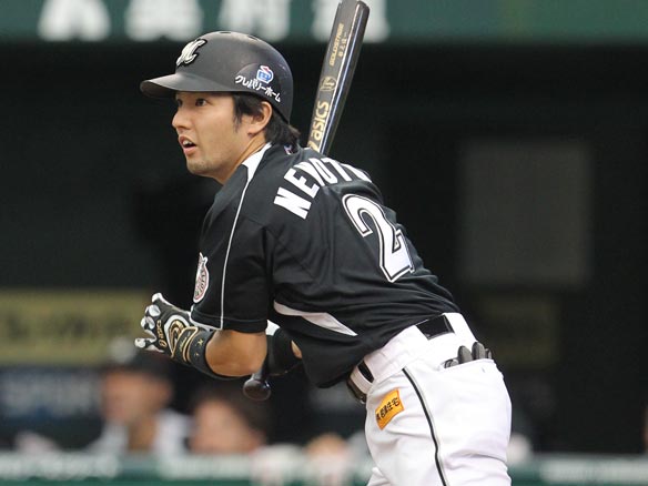 1番 根元 左安 レフトへのヒットを放つ 1塁 |