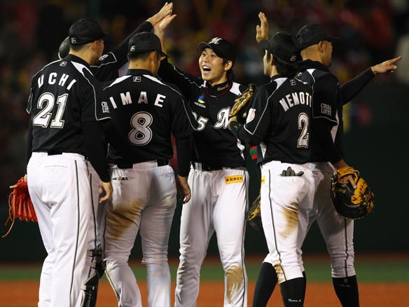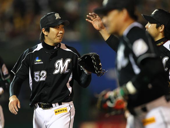 9番 里崎 一犠 見事送りバントを決める 1アウト2,3塁 |