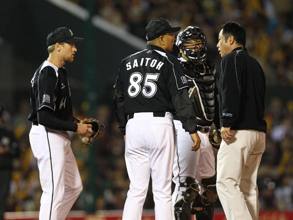 ピンチを迎え齊藤コーチがマウンドに駆け寄る