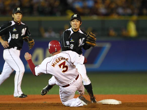 5番 マギー 一邪飛 ファウルフライを井口(一)がつかんでバッターアウト 2アウト |