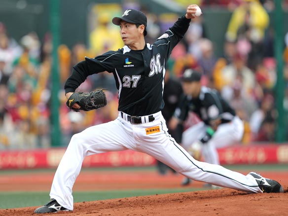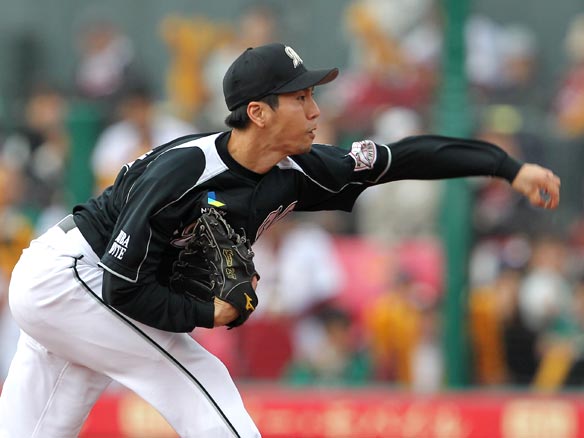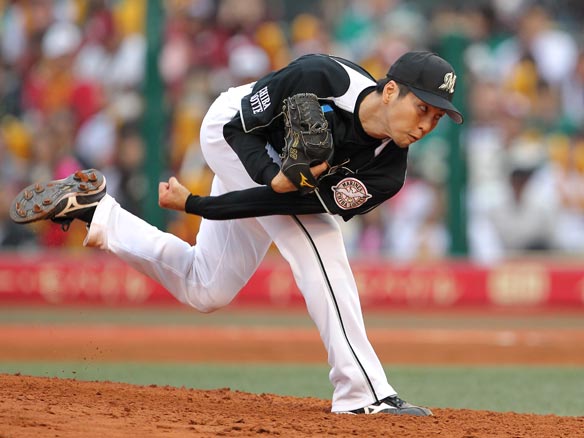 投手 美馬 9番 里崎 空三振 高めの変化球に空振り三振 1アウト |