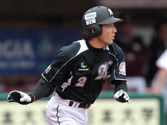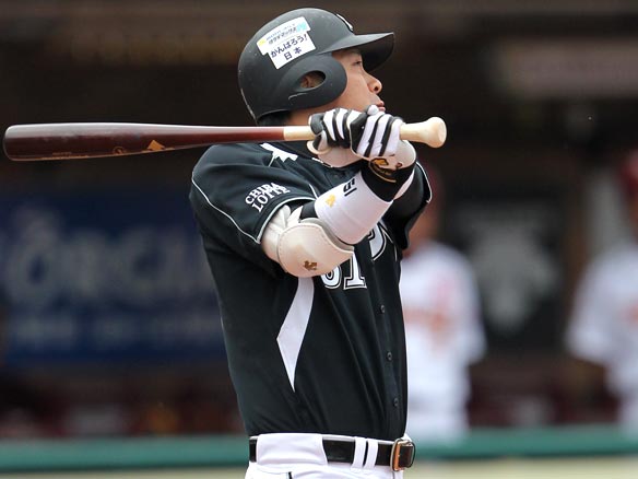 1番 根元 左安 レフトへのヒットを放つ 1塁 |