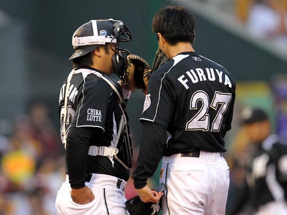 里崎はマウンドへ向かい古谷とサインを再確認する
