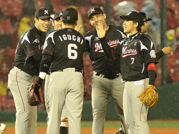 中断を乗り越えて勝利を収めたナインは喜びを分かち合う!