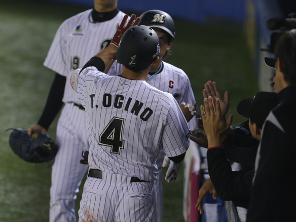 ホームインした荻野貴と犠飛を放った鈴木がハイタッチ!