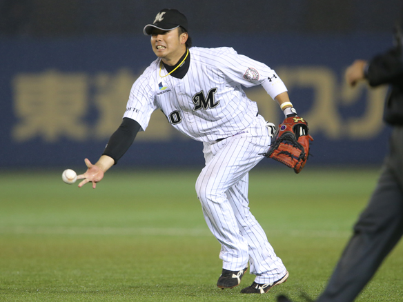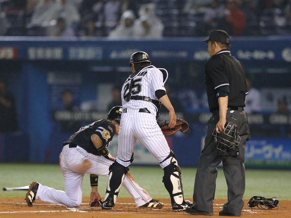 投手 唐川 4番 李大浩 三ゴ 外角低めのカーブを引っかけてサードゴロ 1アウト |