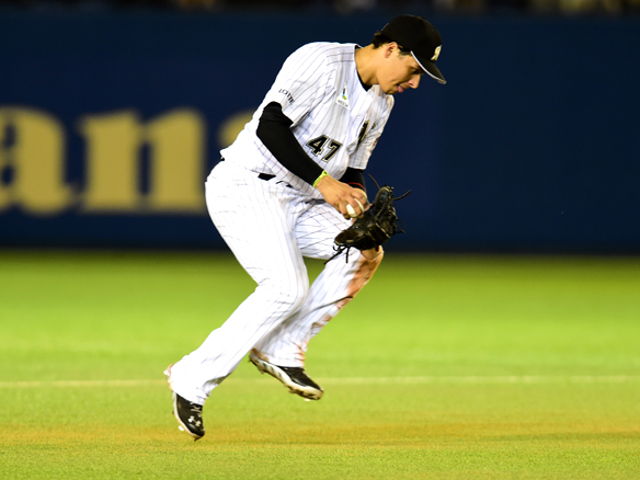 クルーズは長野のゴロを巧みなグラブさばきで捕球!