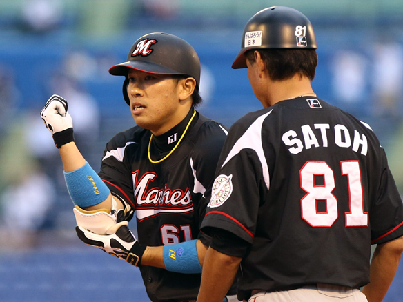3番 角中 左安 レフトへのヒットで出塁 1塁  |