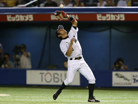 糸井のフライを落下点に入り捕球する根元!
