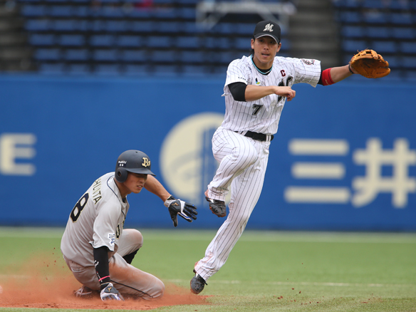 クルーズの送球を受けた鈴木が走者をかわし一塁へ転送