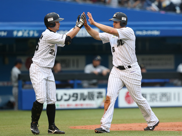 今季初安打を放った青松が塁上でグータッチ!