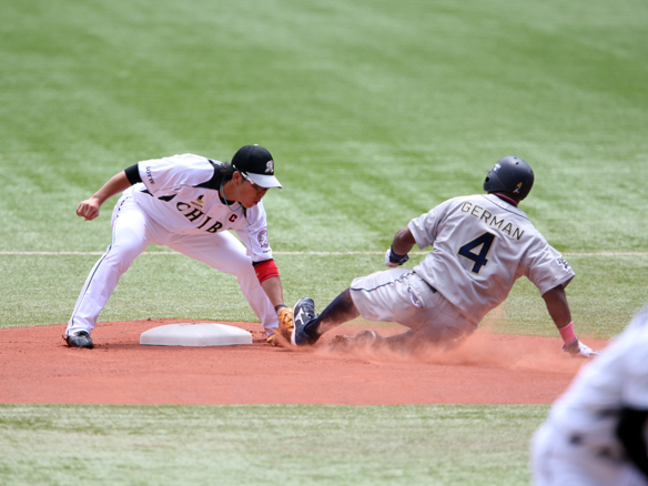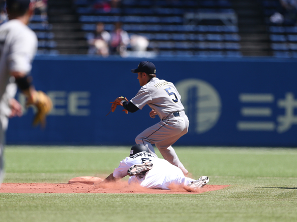 ハフマンが2塁へ気迫あふれるヘッドスライディング!!