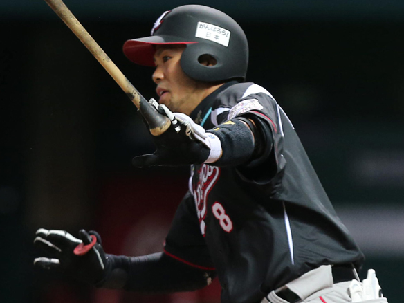 代打・今江が三遊間を破る安打を放つ!