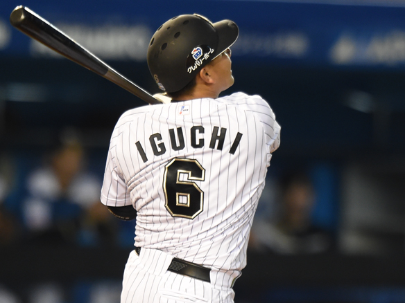 井口は変化球を捉えきれず打球を高々と上げてしまう