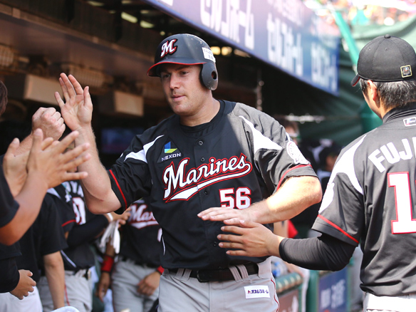 ハフマンは角中の適時打で生還しベンチ前でハイタッチ!