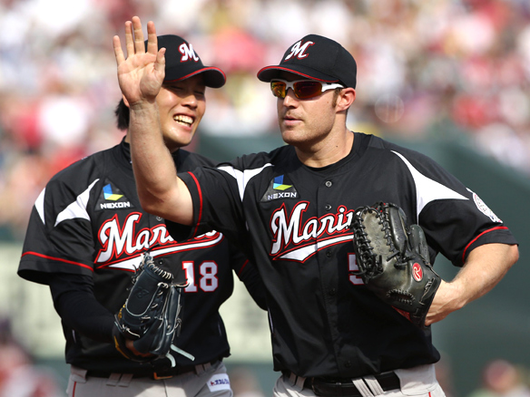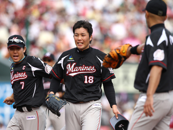 井口はマリーンズファンの待つ右翼席へ勝ち越し弾を放つ!