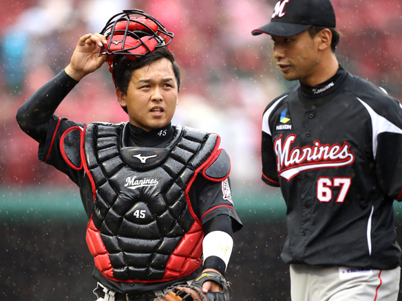 投手 斎藤 ピッチャー斎藤に代わってファルケンボーグがマウンドにあがる 守備変更:聖澤→レフト |
