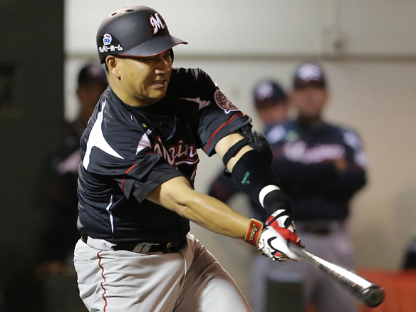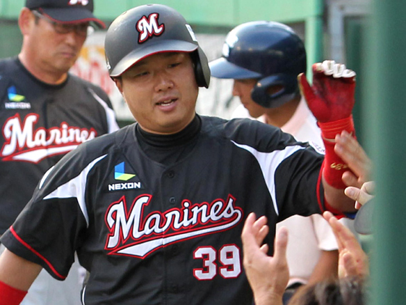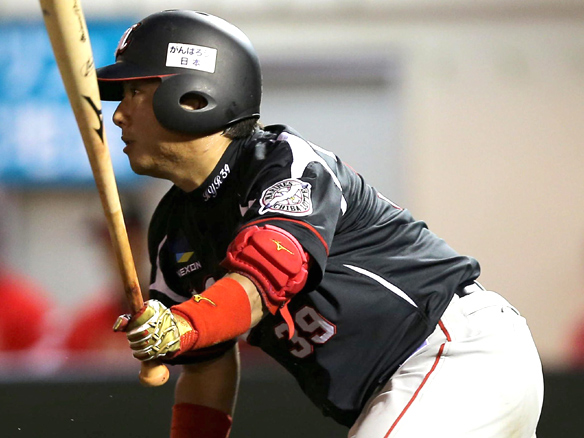 4番 李大浩 中安 センターへのヒットを放つ 1塁 |