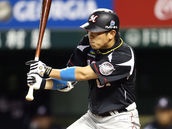 1番 角中 左犠飛 ランナー1,3塁からレフトへの犠牲フライを放つ ![]() 2