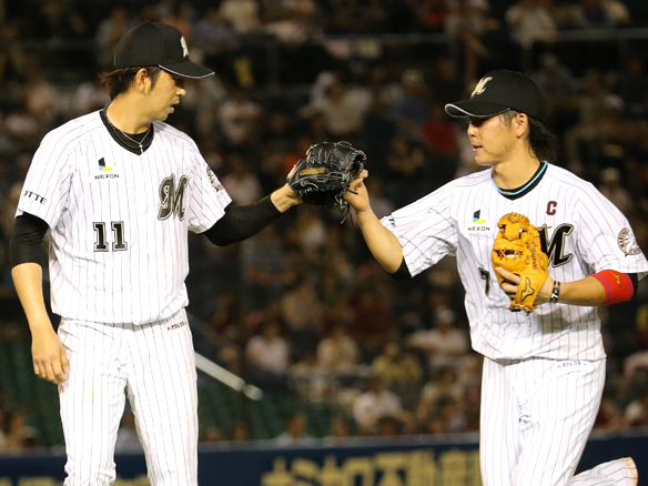 4番 ジョーンズ 四球 外角のスライダーを見送りフォアボール。ロッテ、満塁のピンチをまねく 満塁 |