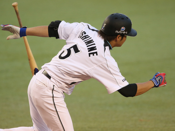 6番 嶋 左安 レフトへのヒットを放つ 1,2塁 |