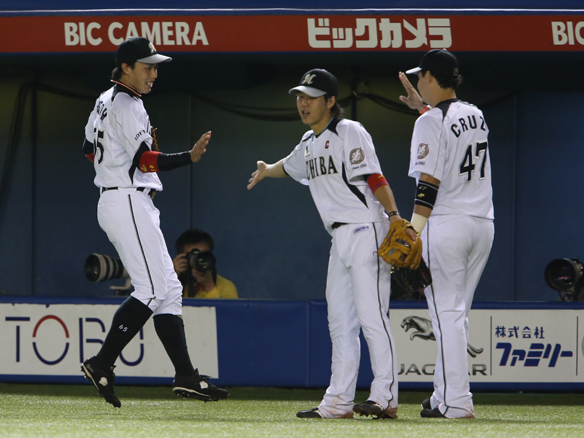 投手 辛島 守備交代:レフト榎本 守備交代:サード岩崎 守備変更:銀次サード→ファースト |