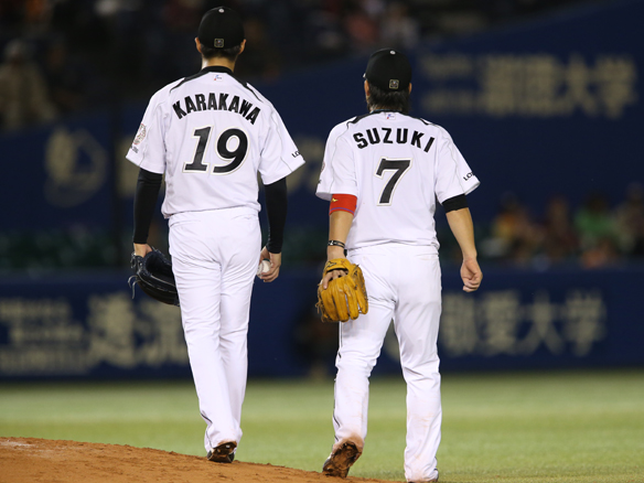 フェンス前で好プレーを見せた加藤が鈴木とタッチをかわす!