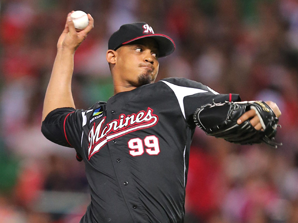 ピッチャーカルロス・ロサに代わって藤岡がマウンドにあがる |