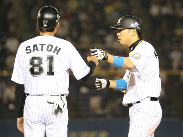 貴重な適時打を放った角中は佐藤コーチとグータッチ!!