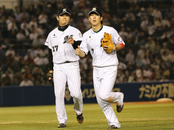 3番 糸井 四球 内角のスライダーを見送り四球を選ぶ 1塁 |