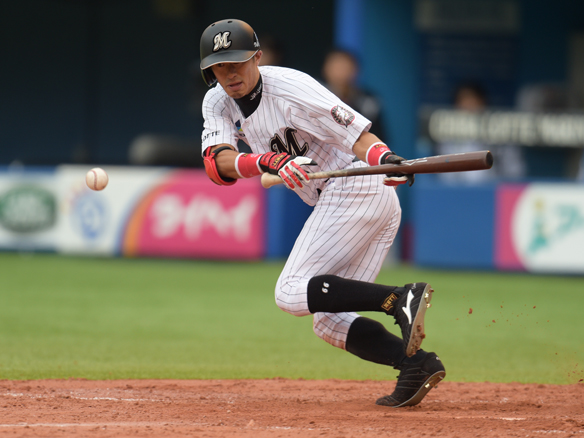 岡田は意表を突いてセーフティーバントを試みる