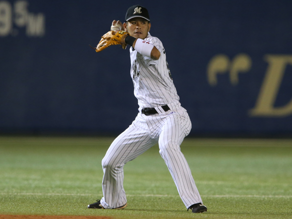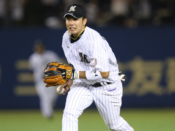 5番 角中 四球 外角のフォークボールを見送り四球を選ぶ 1,2塁 |