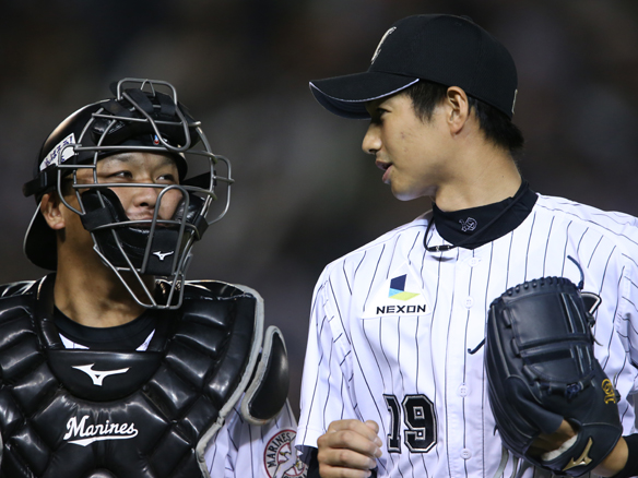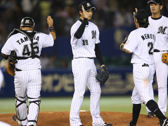 2012年以来の完投勝利を挙げた唐川のもとに集まるナイン!!