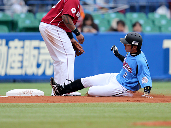 9番 聖澤 左安 レフトへのヒットで出塁 1塁 |