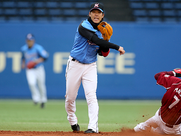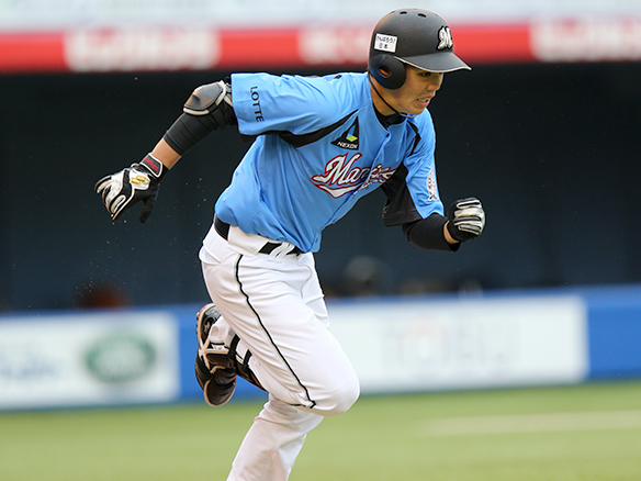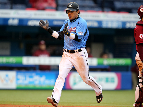 2番 根元 左中三 0アウト2塁の1-0からセンターへのタイムリースリーベースでロッテ同点! ロ1-1楽 3塁 ![]() 1
